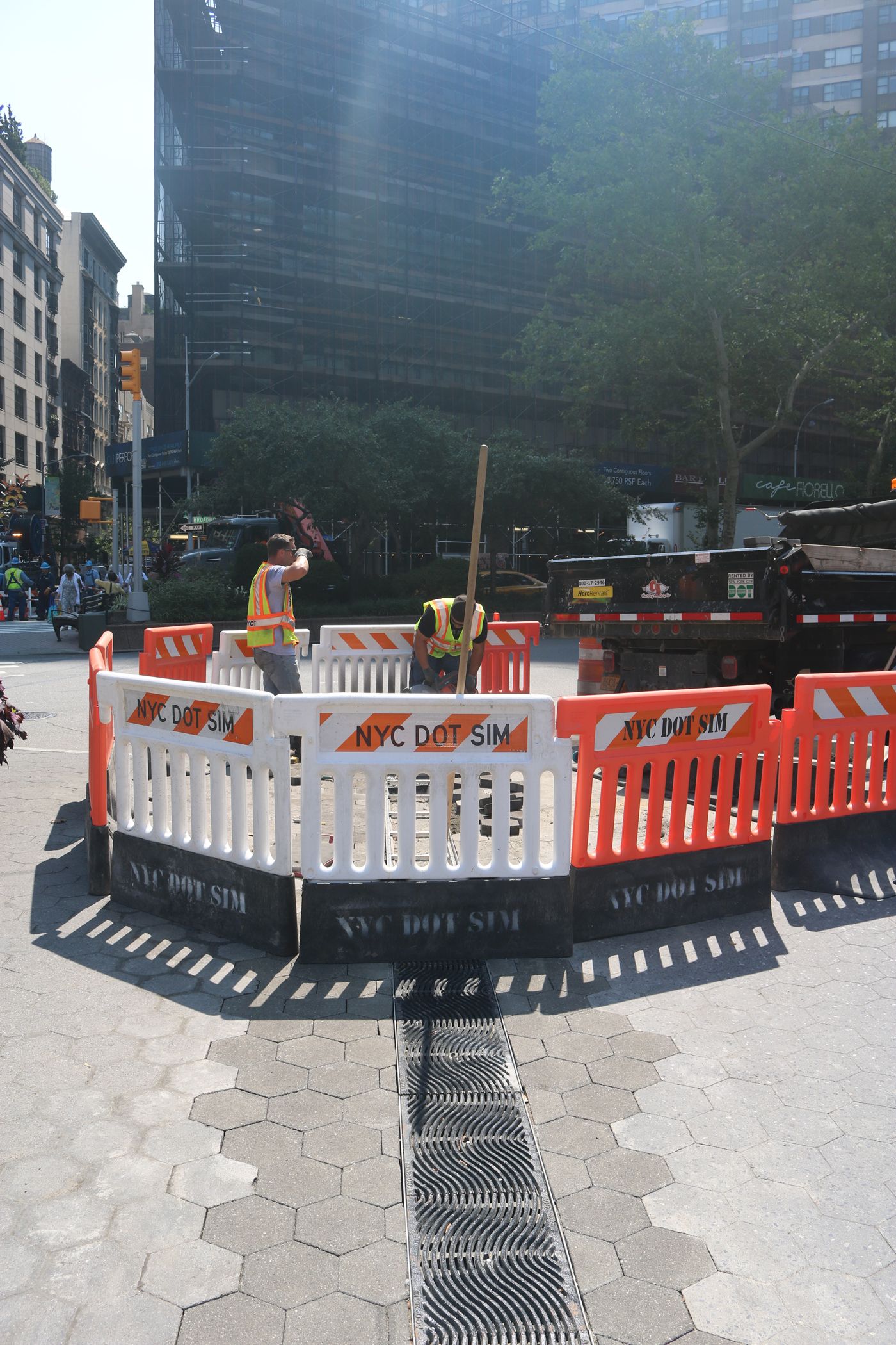 During August 2018, the NYC Department of Transportation installed a trench drain in Dante Park to help alleviate ponding around the park and in the bus stop on Broadway. This time lapse video shows some of the progress of the drain’s construction and installation.