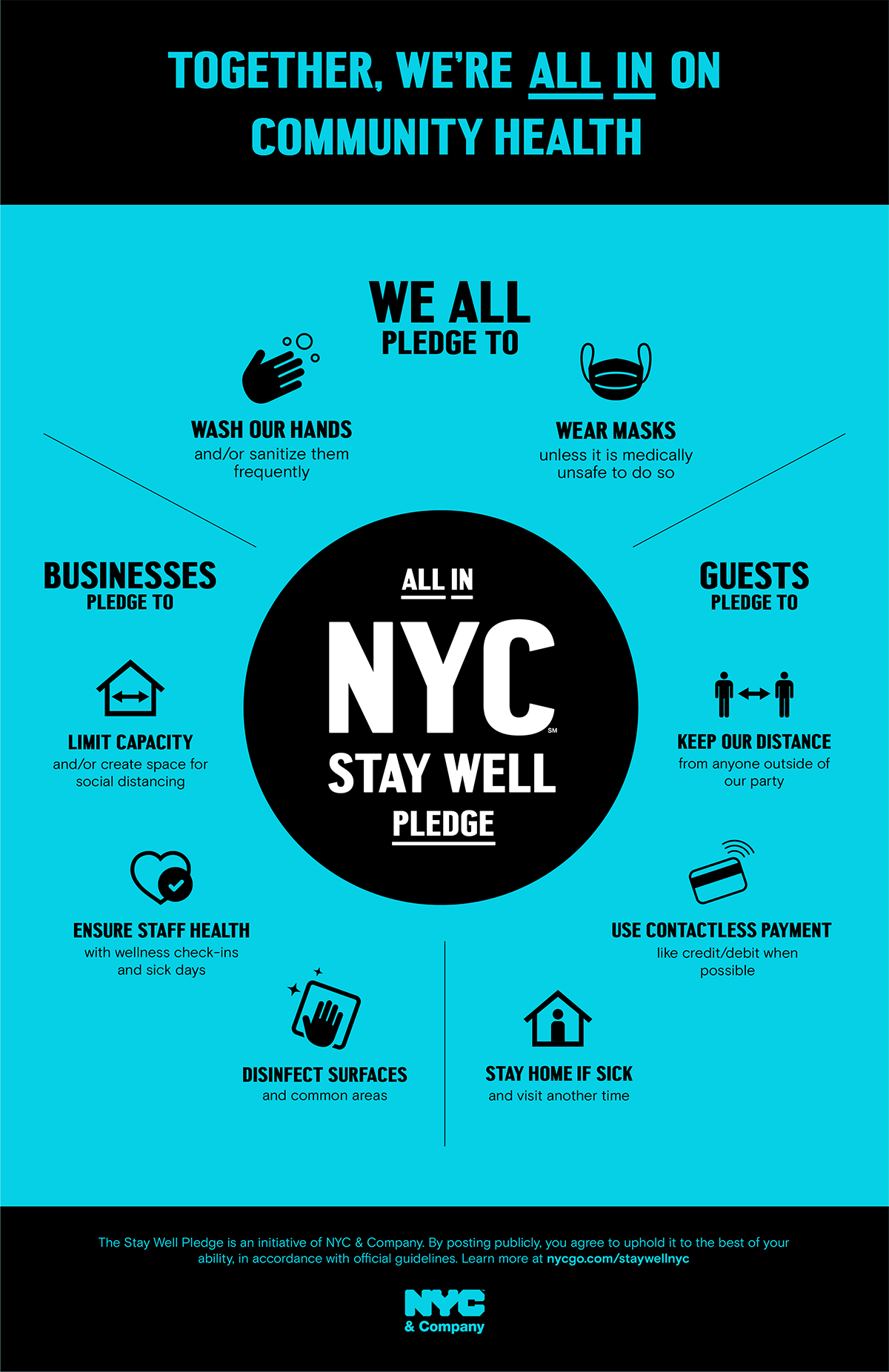 Since the launch of the NYC & Company’s Stay Well NYC Pledge, over 250 businesses have signed on and major destinations around the country have launched health and safety pledges of their own. Harnessing the momentum behind their All In NYC campaign, NYC & Company has relaunched this effort as the All in NYC: Stay Well Pledge.