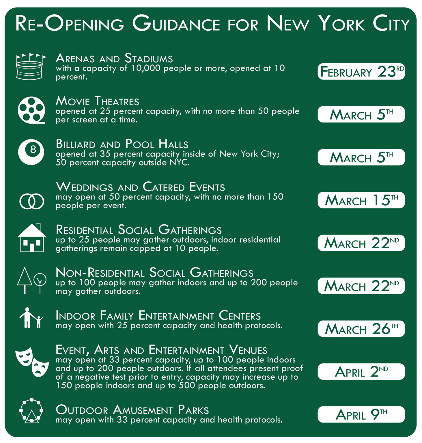 As we continue to monitor changes to COVID-related guidelines and reopening regulations, we will do our best to disseminate useful information. See below for an info graphic from NYC Citywide Event Coordination and Management (CECM) of the re-opening guidance dates between February and April so far. Click here to view a PDF of NYC CECM’s newsletter containing this and other information.