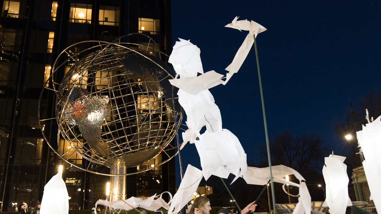 Once the sun had set and the longest night of the year was underway, the procession set off to cheers on Broadway between 62nd and 63rd Street where the Lincoln Plaza Cinema used to be. Braving the bitter cold, it slowly snaked its way south as if it had just woken up from a long slumber, and then made a hairpin turn left onto Central Park West, heading north.