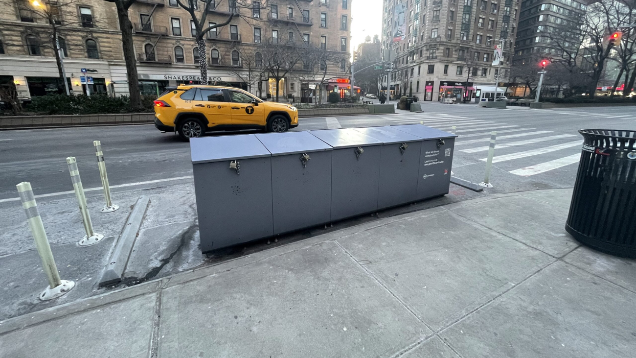 Under the Clean Curbs program, receptacles in the UWS pilot area are emptied several times a day by the Lincoln Square BID, and the contents are then stored in locked, rat-proof containers, to be collected by the city’s Department of Sanitation. A West Side Rag article on the initiative from shortly after it started generated a vigorous 65 comments – expressing everything from deep skepticism that it would be effective, to enthusiastic optimism that the containers (rectangular metal boxes placed in street parking spaces) would make a real difference.