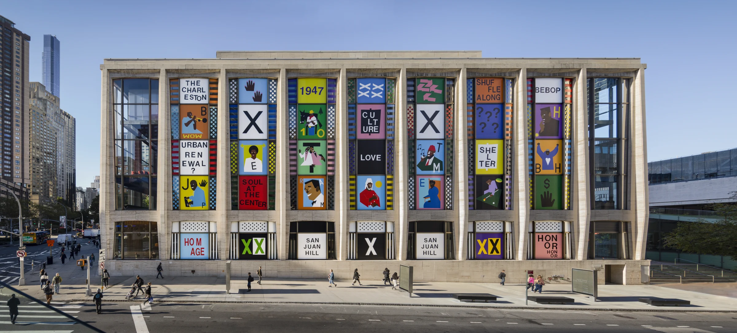 Nina Chanel Abney’s monumental work of art for the façade of David Geffen Hall pays homage to San Juan Hill. In the 1940s and 50s, this predominantly Black and Brown neighborhood was forcibly displaced to make way for redevelopment, including what would become Lincoln Center for the Performing Arts. Abney’s constellation of figures, words, shapes, and symbols reflects the thriving community that lived here. Featured residents include pioneering healthcare workers Edith Carter and Elizabeth Tyler. Also pictured are James P. Johnson, whose music gave rise to the Charleston dance craze, and Thelonious Monk, a pioneer of Bebop and other jazz styles. Reclaiming this important history in her bold and vibrant style, Abney aims to spark curiosity and inspire a more inclusive future.