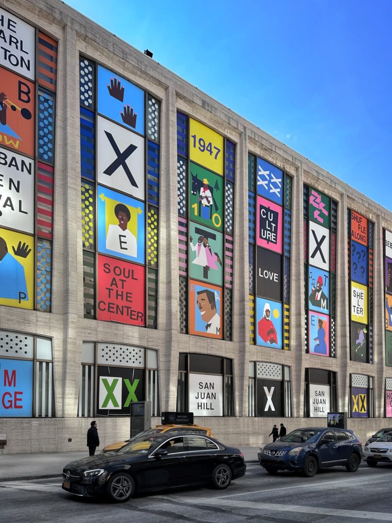 Nina Chanel Abney, San Juan Heal: Nina Chanel Abney’s monumental work of art for the façade of David Geffen Hall pays homage to San Juan Hill. In the 1940s and 50s, this predominantly Black and Brown neighborhood was forcibly displaced to make way for redevelopment, including what would become Lincoln Center for the Performing Arts. Abney’s constellation of figures, words, shapes, and symbols reflects the thriving community that lived here. Featured residents include pioneering healthcare workers Edith Carter and Elizabeth Tyler. Also pictured are James P. Johnson, whose music gave rise to the Charleston dance craze, and Thelonious Monk, a pioneer of Bebop and other jazz styles. Reclaiming this important history in her bold and vibrant style, Abney aims to spark curiosity and inspire a more inclusive future.